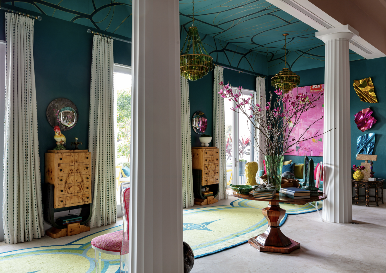 In a recent Palm Beach project, Watts created some privacy between the foyer and living room by hanging art on columns facing the front door. Meanwhile, strategic accent tables create a stylish separation between entry and living. “Traffic still flows freely around the round table; however, the eye has plenty of places to play around,” Watts adds.